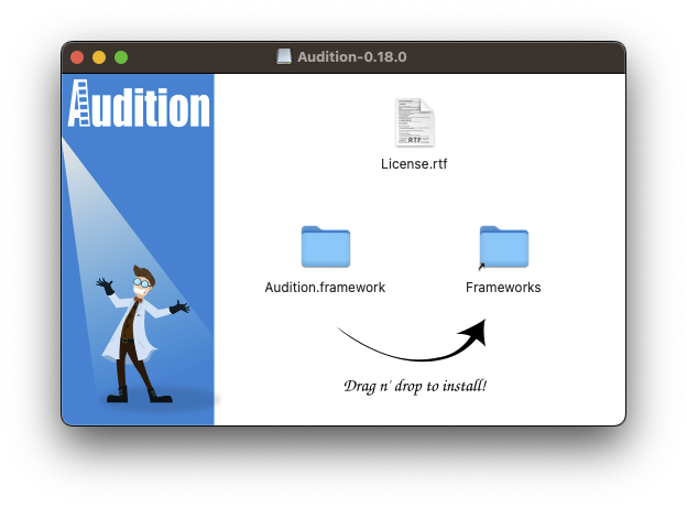 To install Audition on macOS, first download the latest .dmg from the downloads page, double click the disk image to mount it, then drag-and-drop Audition.framework into your Frameworks folder.