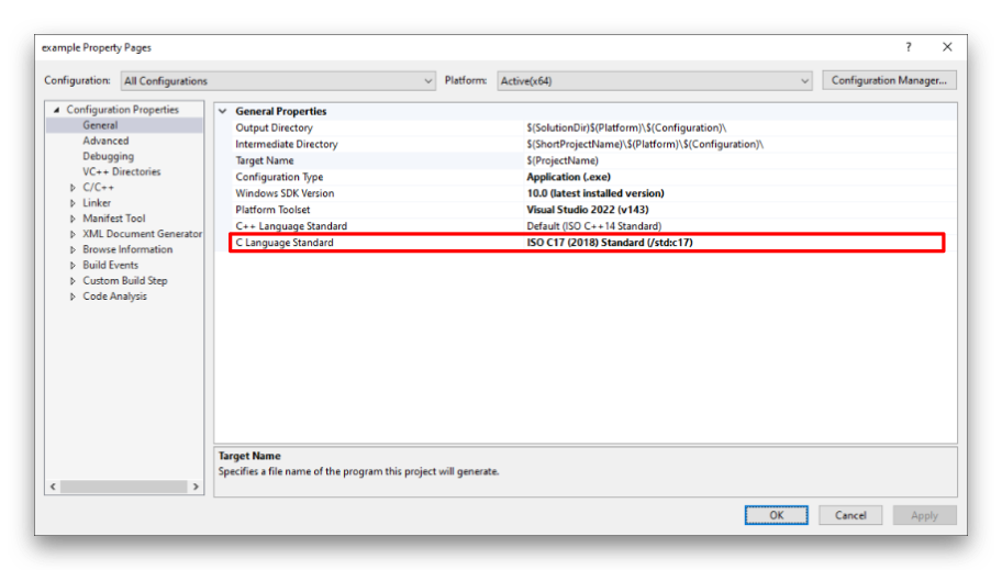 To configure Audition with your Visual Studio project, start by opening the property page of your test runner project. Once opened, navigate to Configuration Properties ➔ General ➔ C Language Standard and set the C standard to C11 or newer. This is necessary because Visual Studio defaults to C89, but Audition requires C11 or newer.
