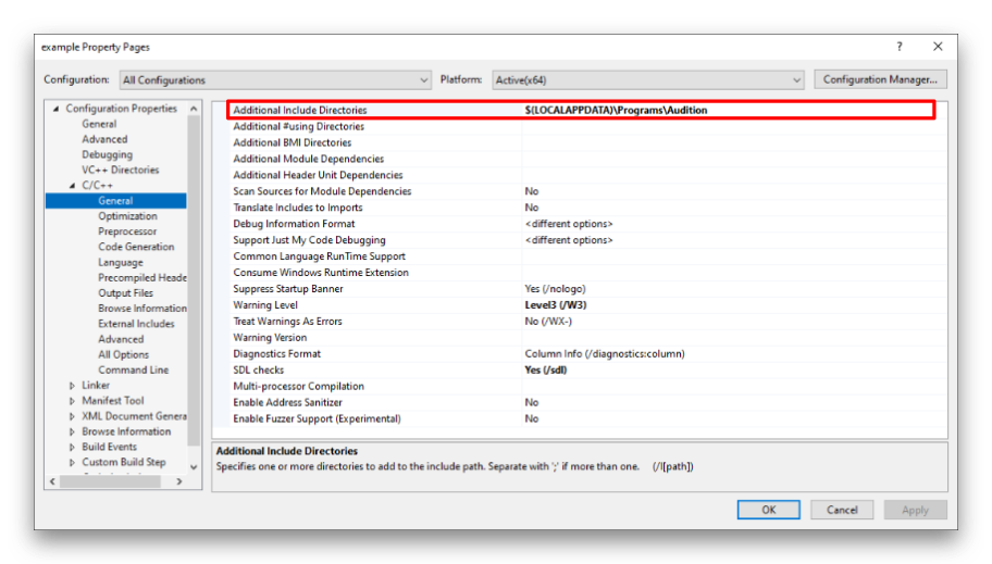 Next, under Configuration Properties ➔ C/C++ ➔ General add to the Additional Include Directories the path where the Audition header file resides.