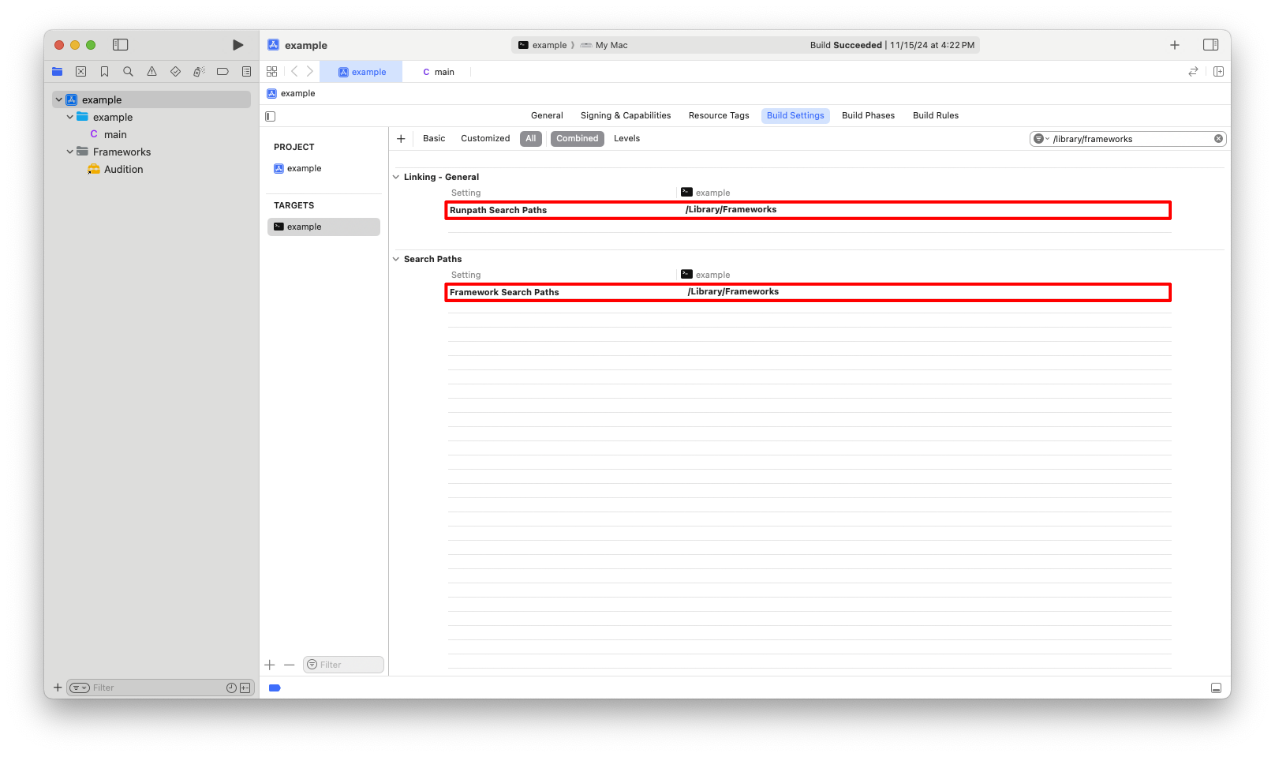 To ensure Audition is discoverable at runtime, you must set the Build Settings ➔ Runpath Search Paths and Framework Search Paths to the directory where Audition.framework is located. If you installed the Audition framework by dragging it into the “Frameworks” directory, as instructed by the DMG, then it will be located in “/Library/Frameworks”.