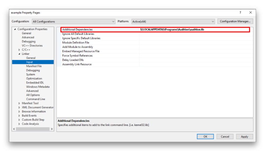 Next, under Configuration Properties ➔ Linker ➔ Input, add to the Additional Dependencies property the path to the audition.lib file.