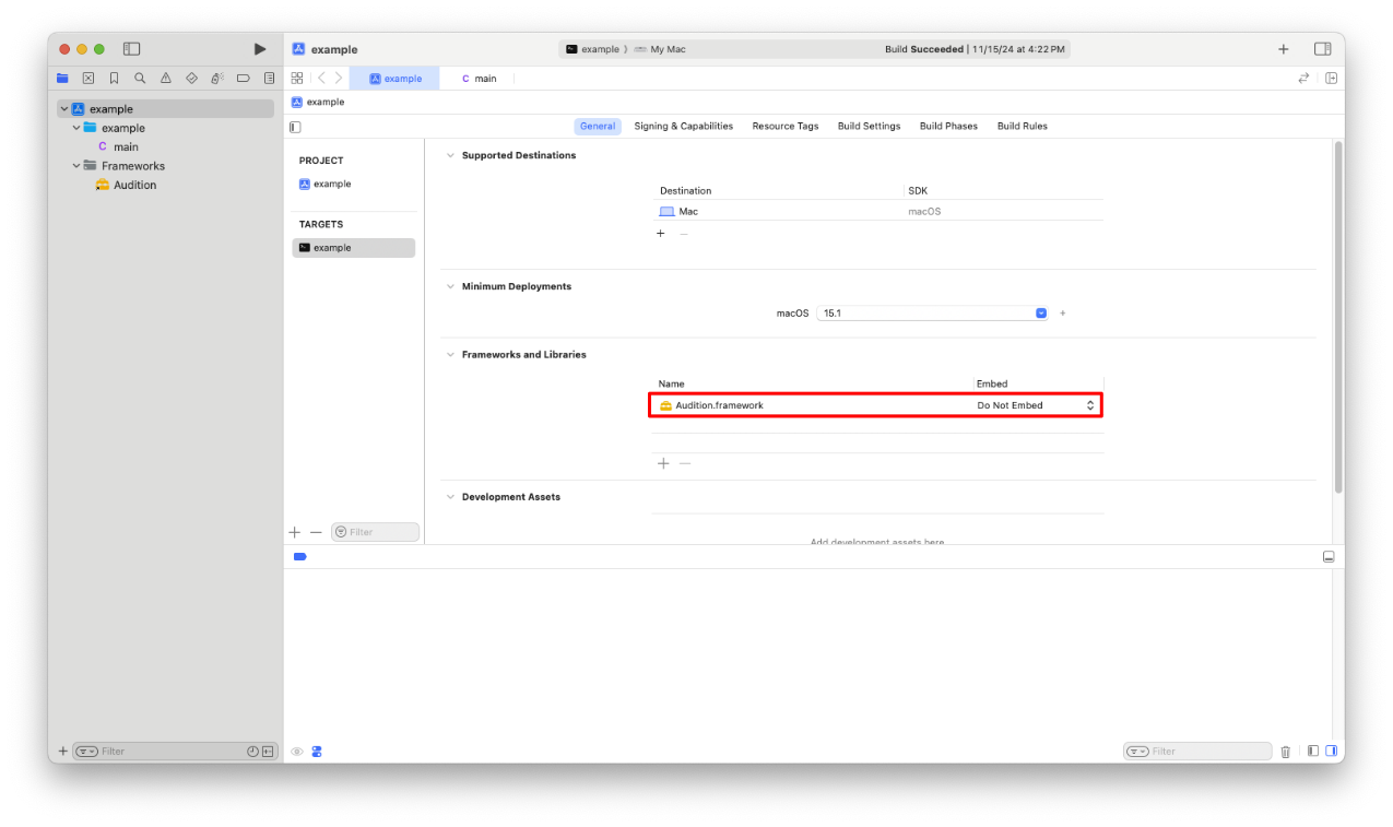 You can now discover Audition.framework from Xcode just as you would any other framework. You can also discover Audition with CMake.