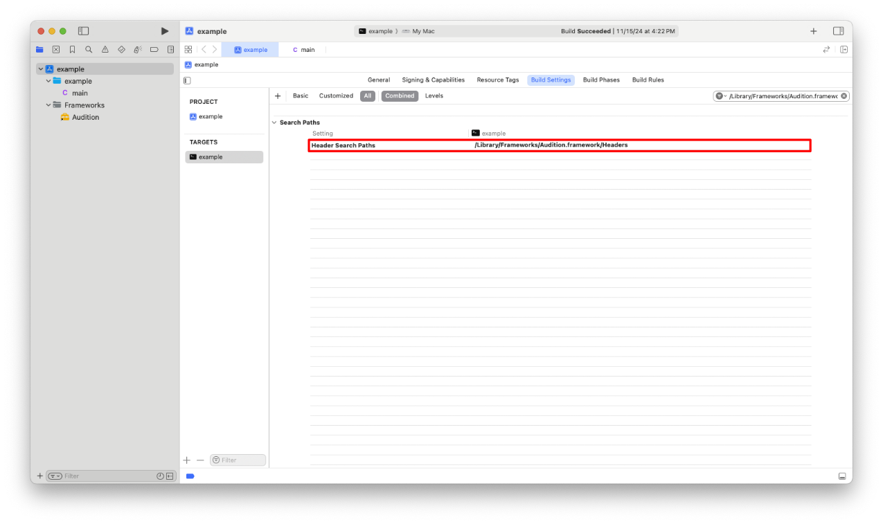which is how it’s included on non-macOS platforms, then you must update the Build Settings ➔ Header Search Path option to reference the Audition header directory.