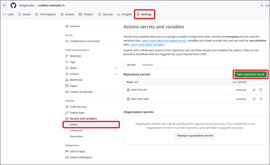Start by creating two secret keys for your Audition user and key. You can create these secrets keys by first navigating to your projects Settings tab ➔ Secrets and variables sidebar link (under “Security”) ➔ Actions. From here you can create two new repository secrets for the user and key. The names you give these secrets are the names you will refer to them by from your workflow YAML file. For this example, we’ll name them AUDITION_USER and AUDITION_KEY.